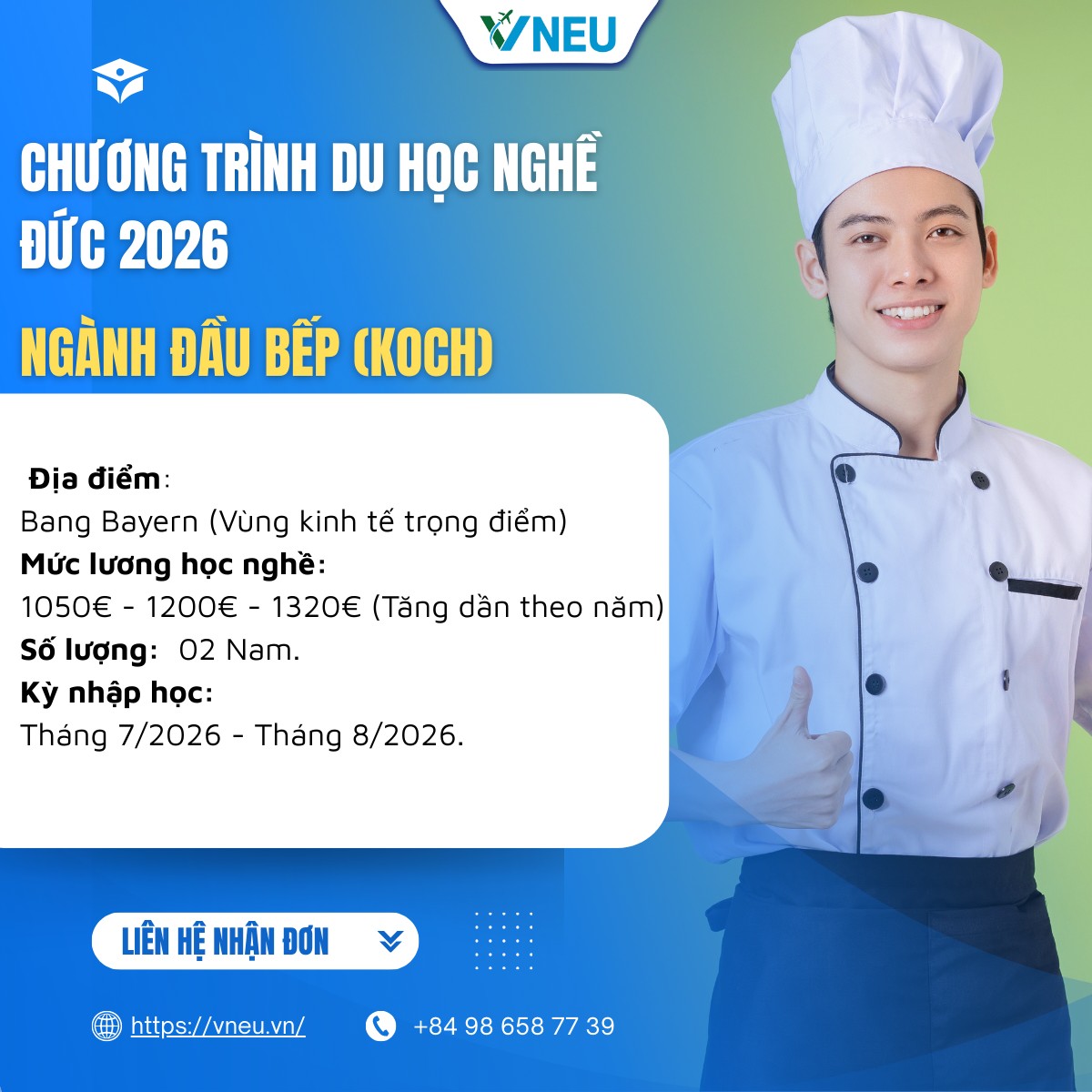 VNEU chính thức thông báo mở đơn tuyển 02 nam học viên cho kỳ nhập học tháng 07/08.2026 ngành Đầu bếp (Koch) tại bang Bayern – khu vực giàu có bậc nhất CHLB Đức.