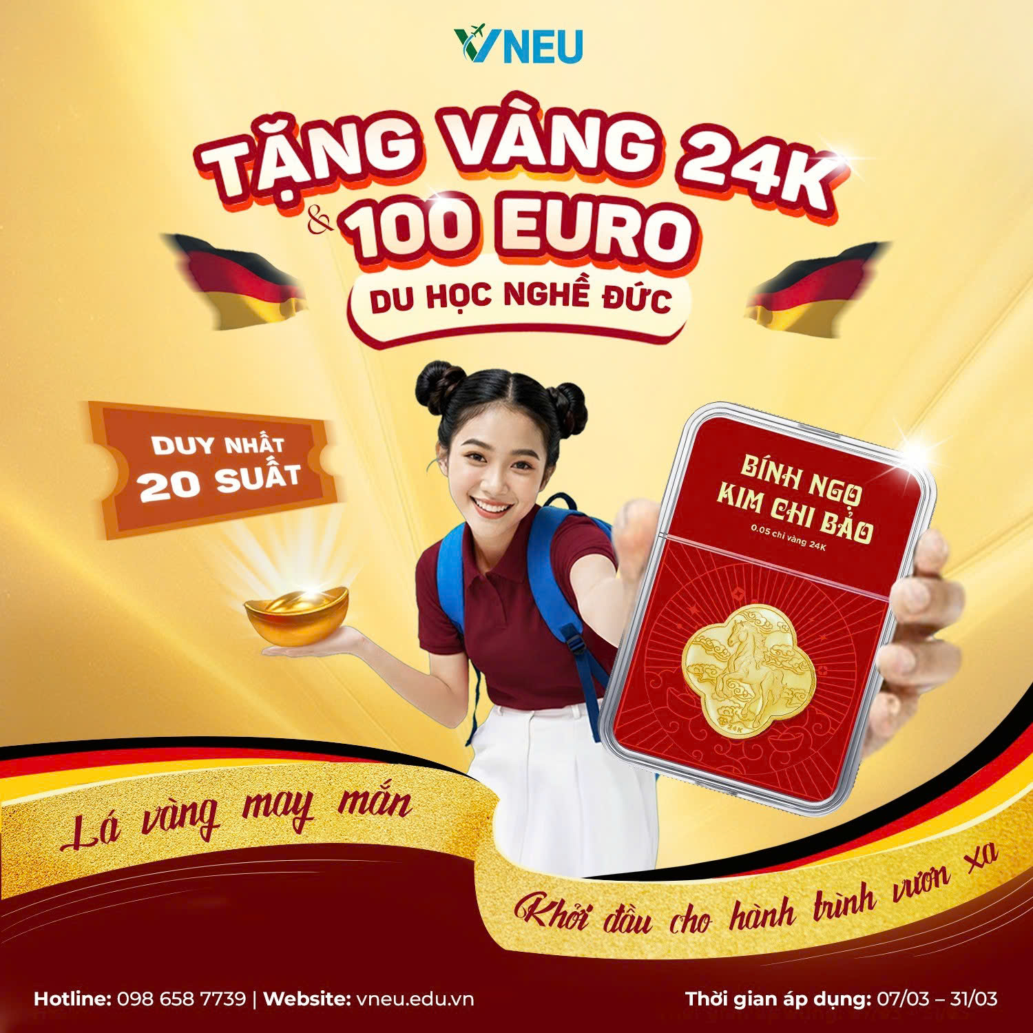 Tiếp nối thành công của chương trình Khai xuân mở vận trong dịp Tết Bính Ngọ, Trung tâm Du học VNEU chính thức kích hoạt chiến dịch tri ân lớn nhất tháng 3 mang tên Lá vàng may mắn – Khởi đầu cho hành trình vươn xa. Đây là lời chúc hanh thông và sự hỗ trợ thiết thực dành cho các bạn học viên trên con đường chinh phục sự nghiệp toàn cầu tại CHLB Đức.
