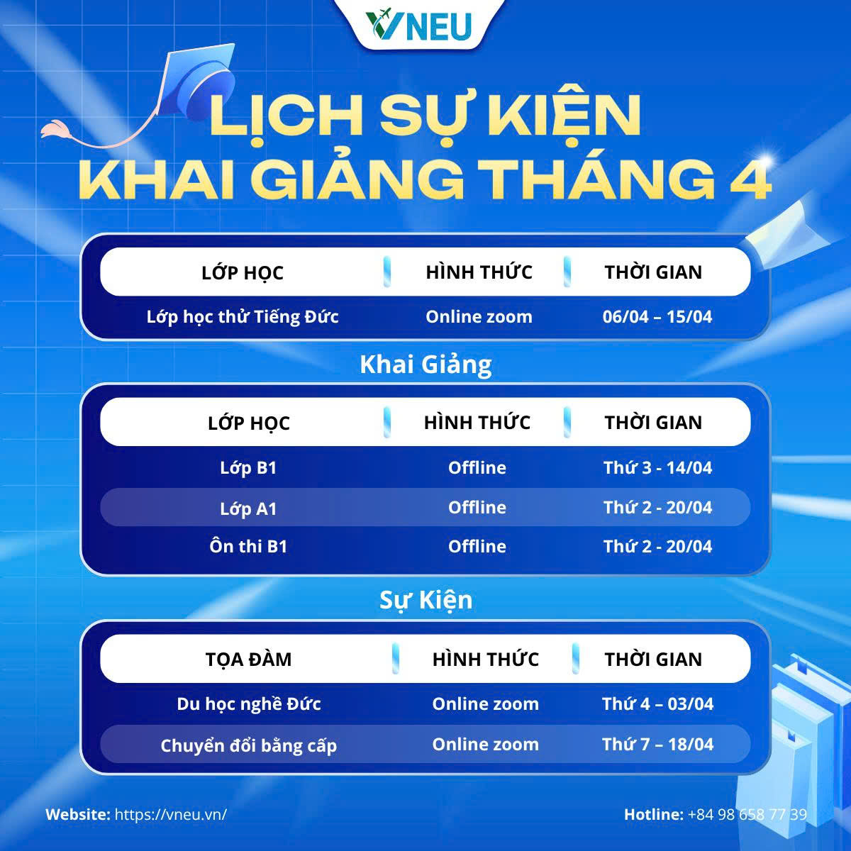 Chào đón tháng 4, Trung tâm Du học VNEU chính thức công bố chuỗi sự kiện tọa đàm và lịch khai giảng các khóa đào tạo tiếng Đức trọng điểm. Đây là thời điểm vàng để các bạn chốt lộ trình, sẵn sàng cho hành trình chinh phục tương lai tại CHLB Đức.