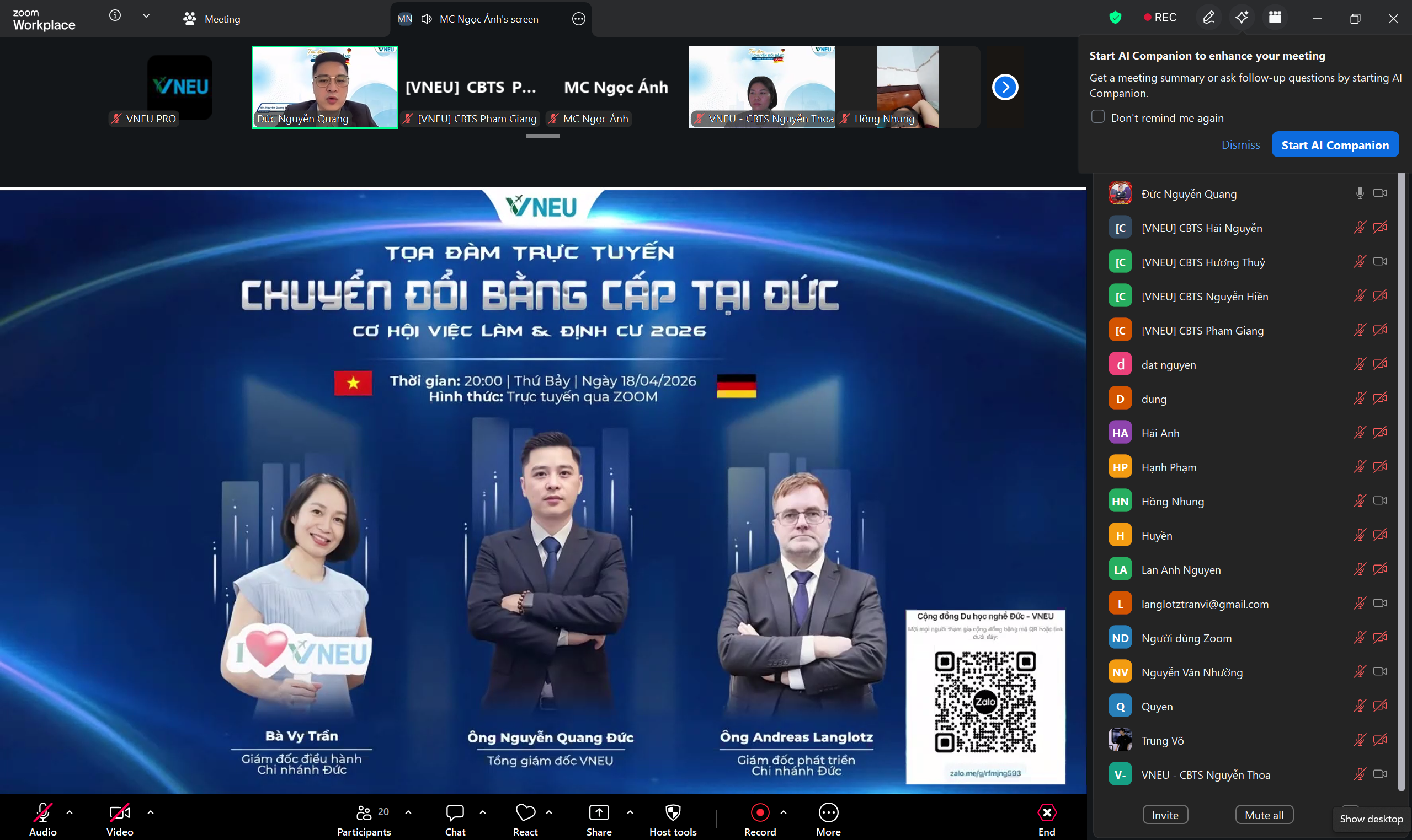 Tối ngày 18/04/2026 vừa qua, VNEU đã tổ chức thành công buổi tọa đàm trực tuyến chuyên sâu về chủ đề Chuyển đổi bằng cấp tại CHLB Đức. Sự kiện đã thu hút sự tham gia của đông đảo anh chị học viên đã tốt nghiệp Cao đẳng, Đại học cùng các bậc phụ huynh trên toàn quốc, mở ra một ngã rẽ sự nghiệp đầy triển vọng tại nền kinh tế hàng đầu Châu Âu.